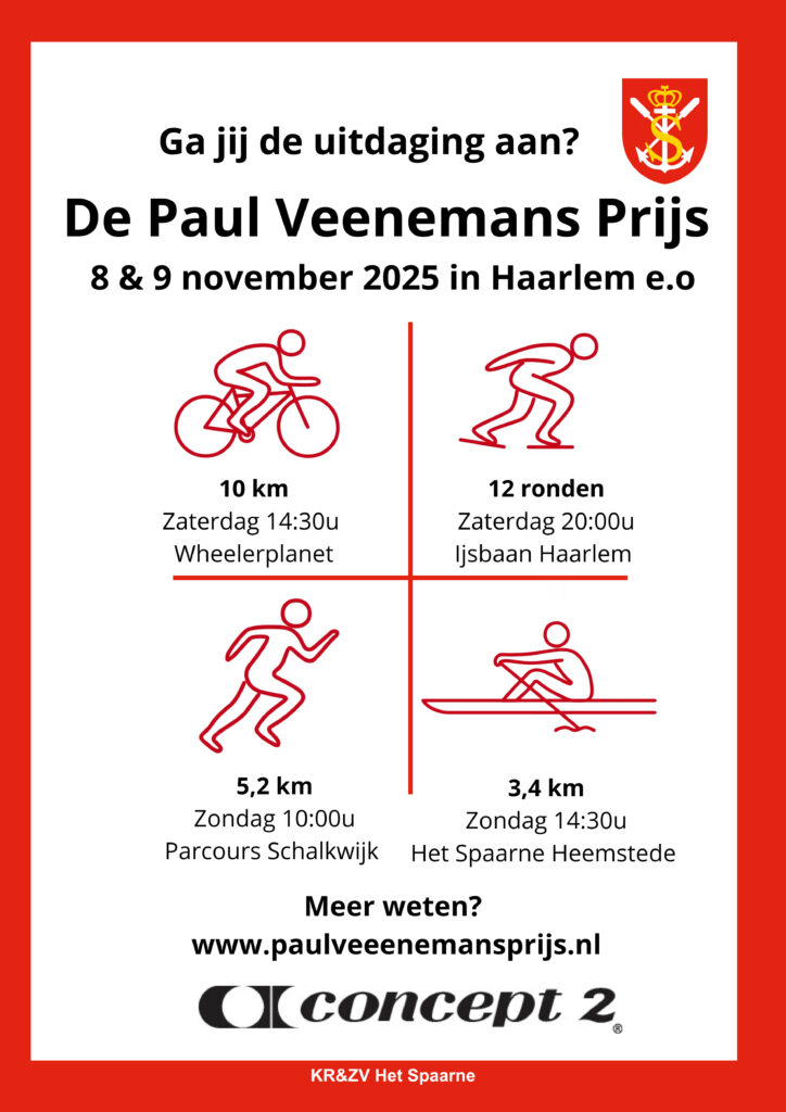 De Paul Veenemans Prijs 2025 wordt dit jaar georganiseerd door het Spaarne en is het weekend van 8 & 9 novemember in Haarlem. De Paul Veenemans Prijs is een meerkamp met de onderdelen Roeien , Hardlopen, Fietsen en Schaatsen. Deelnemers aan de wedstrijd worden geacht om naast het verplichte onderdeel roeien aan minimaal 2 van de 3 andere onderdelen deel te nemen. Meer informatie kan je vinden op Paul Veenemans Prijs en KNRB – Roeievenementen. De kosten zijn € 60,- per persoon. Wil je meedoen stuur dan even een mail naar wedstrijd@willem3.nl en vermeld even in welke veld en aan welke onderdelen je wilt meedoen.